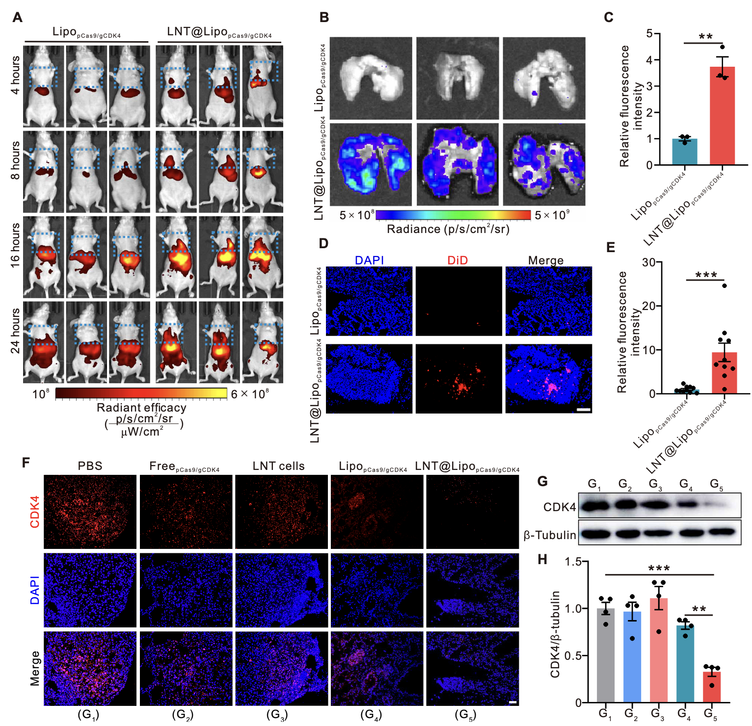 体内分布实时成像:采用DiD荧光染料标记LipopCas9/gCDK4纳米粒,通过活体荧光成像系统(IVIS)实时观察小鼠静脉注射后的体内分布。结果显示,注射后16小时内,LNT@LipopCas9/gCDK4组小鼠肺部荧光信号持续强于单纯LipopCas9/gCDK4组(图4A);离体肺部组织成像显示,注射6小时后,LNT@LipopCas9/gCDK4组肺部荧光信号强度约为LipopCas9/gCDK4组的4倍(图4B、C);病理切片荧光染色定量分析显示,LNT@LipopCas9/gCDK4组肺部药物累积量较LipopCas9/gCDK4组提升近10倍(图4D、E)。此外,该递送系统在肝脏、脾脏等其他主要器官的荧光信号虽略有升高,但远低于肺部富集水平(图S8),证实其具有显著的肺靶向特异性。