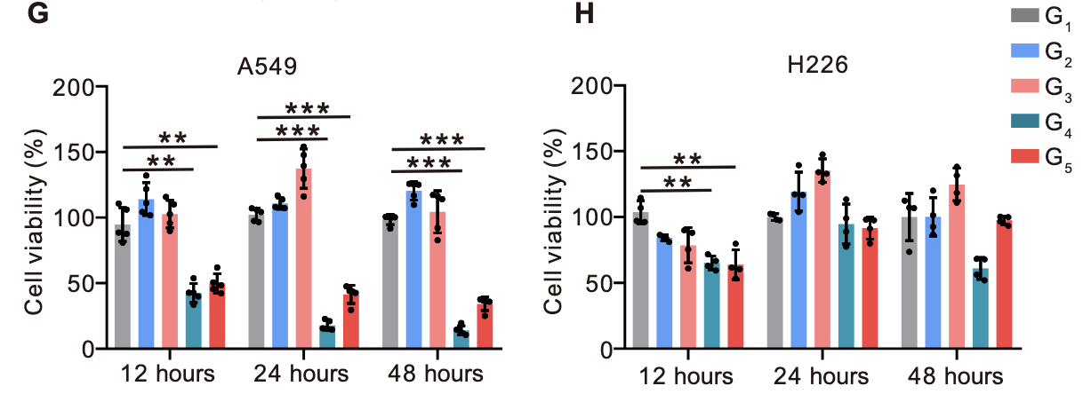 细胞活性检测(CCK-8实验):将LNT@LipopCas9/gCDK4与A549细胞共培养后,使用CCK-8法检测细胞活性。结果显示,处理24小时后,LipopCas9/gCDK4组与LNT@LipopCas9/gCDK4组的A549细胞活性均下降约50%;延长处理时间至48小时,两组死亡细胞比例均超过90%,表明CDK4敲除可有效抑制KRAS突变型NSCLC细胞存活(图3G)。而在H226细胞中,LNT@LipopCas9/gCDK4处理后细胞活性仅出现轻微下降,证实合成致死效应具有KRAS突变依赖性(图3H)。