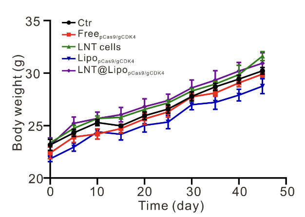 治疗期间每周监测小鼠体重变化,结果显示,各组小鼠体重均无显著波动(图S10),未出现体重下降、精神萎靡、食欲减退等不良反应,证实LNT@LipopCas9/gCDK4治疗策略具有良好的体内生物安全性,未对小鼠正常生理状态造成明显影响。