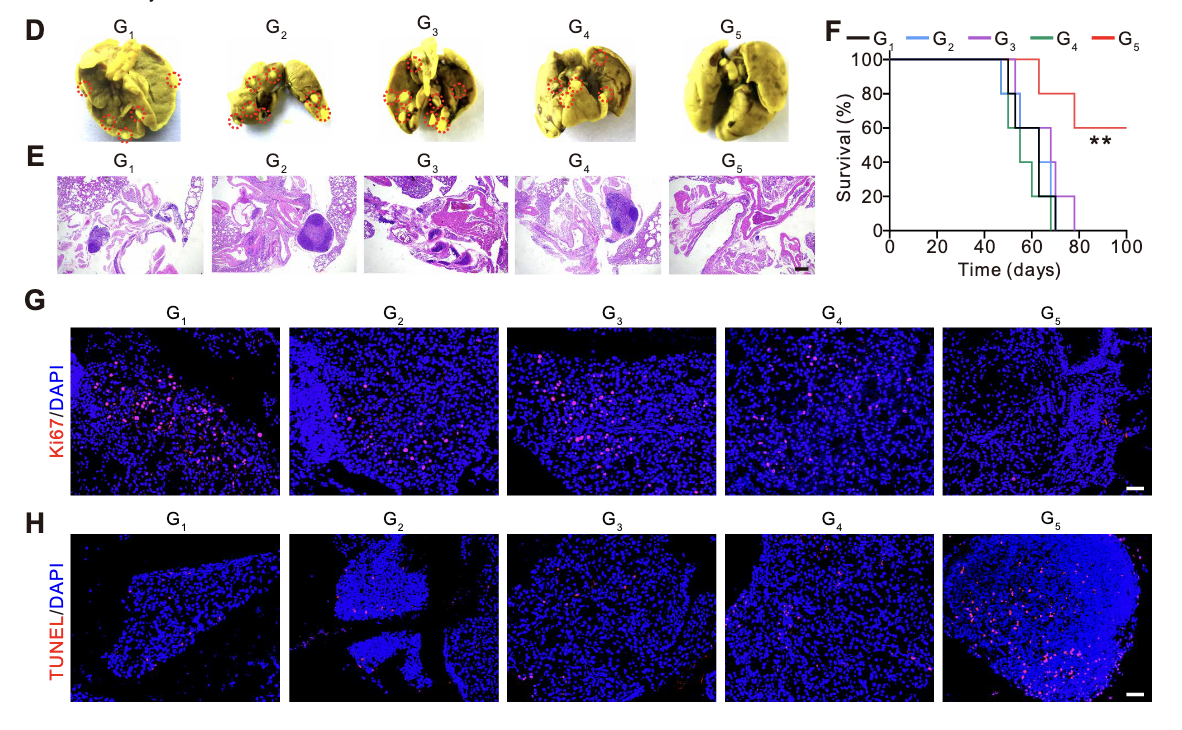 肿瘤结节计数与病理验证:治疗终点(肿瘤进展至伦理终点或治疗后60天)解剖小鼠肺部,肉眼观察及计数显示,LNT@LipopCas9/gCDK4组的肺部肿瘤结节数量显著少于其他各组(图5D);HE染色结果进一步证实,该组肿瘤组织体积缩小、细胞密度降低,而对照组肿瘤组织呈典型恶性增殖特征(图5E),从病理层面验证了治疗效果。