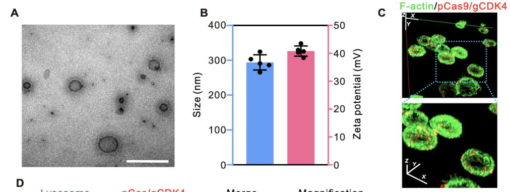 透射电子显微镜(TEM):取适量LipopCas9/gCDK4纳米粒悬液滴加至铜网上,磷钨酸负染后,通过透射电子显微镜(TecnaiG2F20)观察纳米粒形态并测量粒径范围。TEM图像显示,LipopCas9/gCDK4纳米粒呈类球形均匀分布,粒径范围为100~400nm(图2A)。
