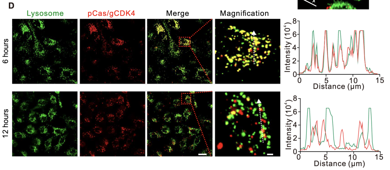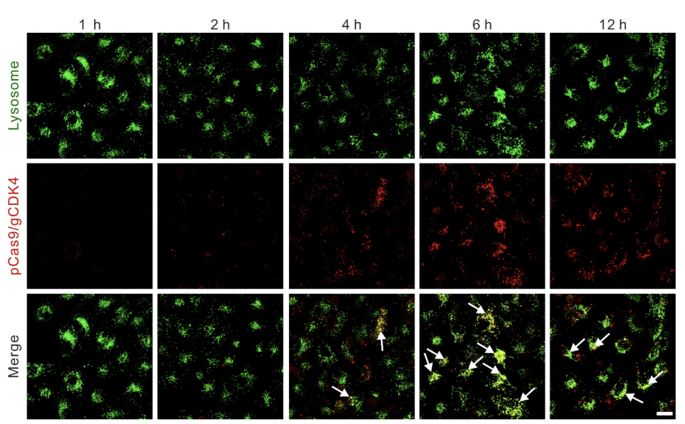 将LNT@LipopCas9/gCDK4复合物与A549细胞共培养,分别在2、6、12小时加入溶酶体特异性探针(LysoTrackerGreen)孵育30分钟,DAPI染核后,通过ZeissLSM800共聚焦显微镜观察iFluor647标记的质粒(红色荧光)与溶酶体(绿色荧光)的共定位情况,计算共定位系数。亚细胞定位结果显示,共培养2小时时,细胞内红色荧光信号微弱,推测此时纳米粒尚未从LNT-A549细胞表面脱落(图S5);6小时时,红色荧光与溶酶体绿色荧光的共定位系数较高,表明部分LipopCas9/gCDK4纳米粒被A549细胞吞噬并包裹于溶酶体中;12小时时,两者共定位系数显著降低,红色荧光在细胞质中呈弥散分布,证实相当一部分纳米粒成功实现溶酶体逃逸(图2D)。