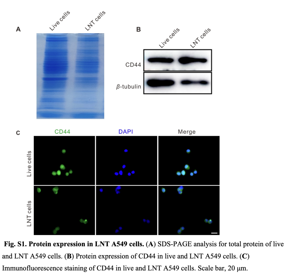 SDS-聚丙烯酰胺凝胶电泳(SDS-PAGE):分别提取LNT-A549细胞与活A549细胞的总蛋白,经蛋白定量后,取等量蛋白进行SDS-PAGE电泳,考马斯亮蓝染色后观察蛋白条带分布。SDS-PAGE电泳结果显示,LNT-A549细胞的蛋白条带图谱与活A549细胞高度一致,其几乎保留了活细胞所有表达的蛋白(图S1A)。