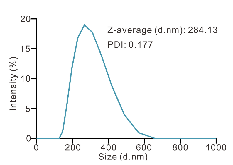 动态光散射(DLS):采用马尔文激光粒度仪测定LipopCas9/gCDK4纳米粒的粒径分布、平均粒径、zeta电位及聚合物分散指数(PDI),每个样本检测3次,取平均值。DLS检测结果显示,其平均粒径为294nm,zeta电位为40.8mV,聚合物分散指数(PDI)为0.177,表明纳米粒具有良好的分散均一性(图2B、图S3)。