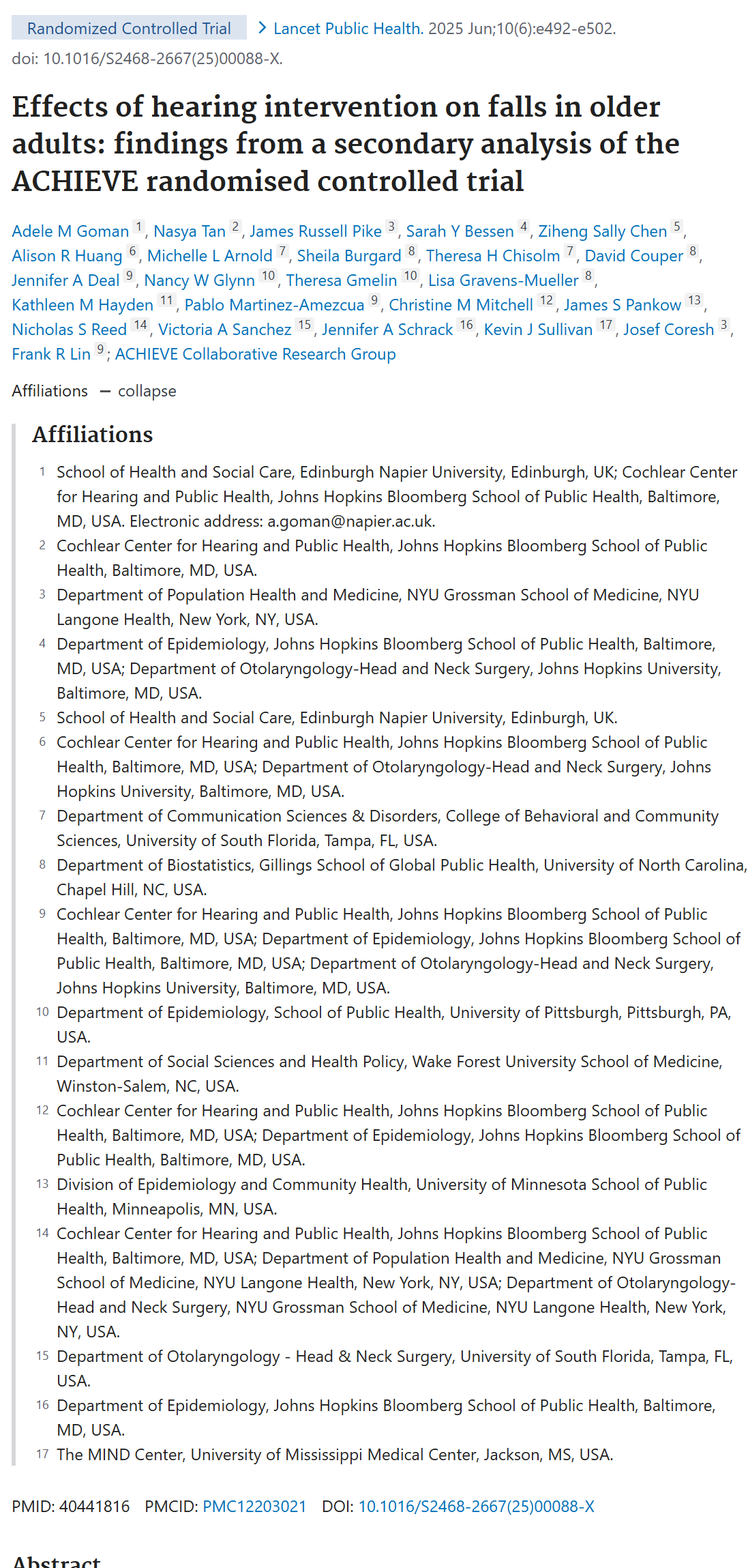 中文题目:听力干预对老年人跌倒的影响:基于 ACHIEVE 随机对照试验的二次分析结果
