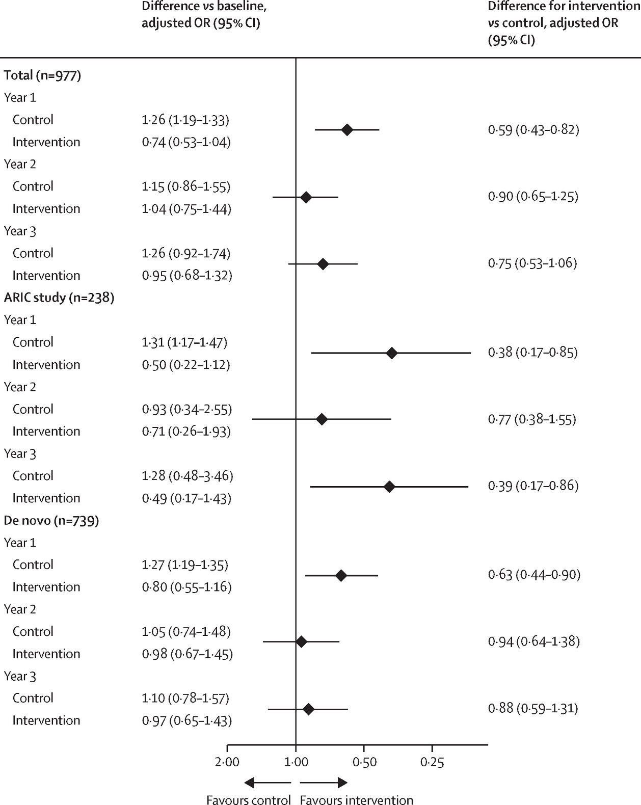 这一效果同样在ARIC队列(均值差-0.68次 [95%CI:-1.01至-0.35])和社区新招募队列(均值差-0.20次 [95%CI:-0.38至-0.02])中均得以体现。(见图1)