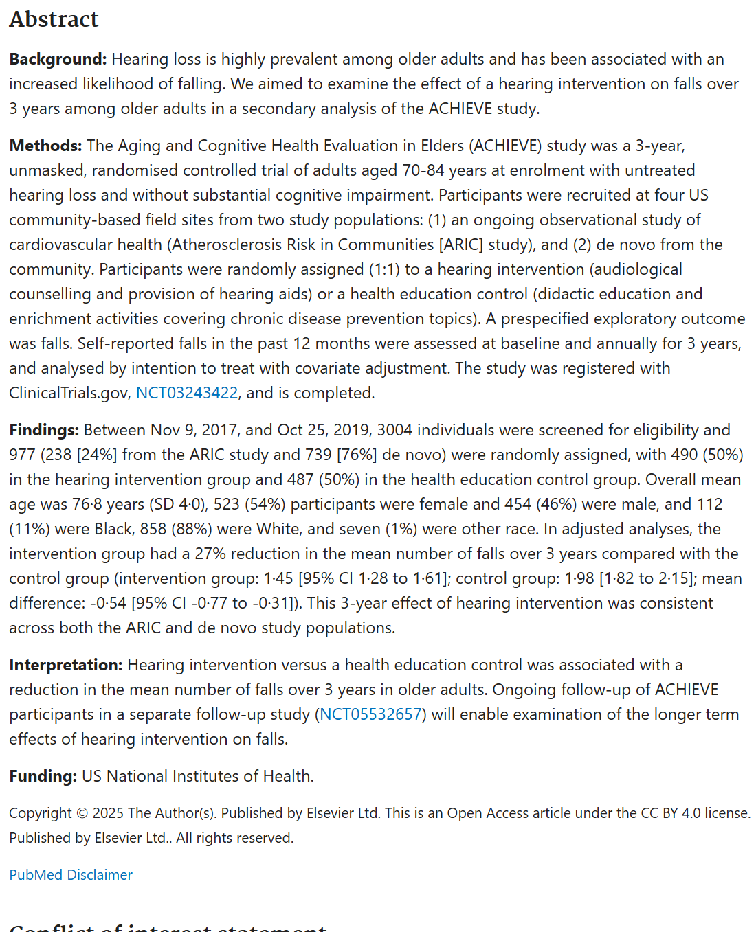 听力干预相较于健康教育对照组,可降低老年人3年内平均跌倒次数。通过在独立随访研究(NCT05532657)中持续追踪ACHIEVE项目参与者,将有助于评估听力干预对跌倒风险的长期影响。