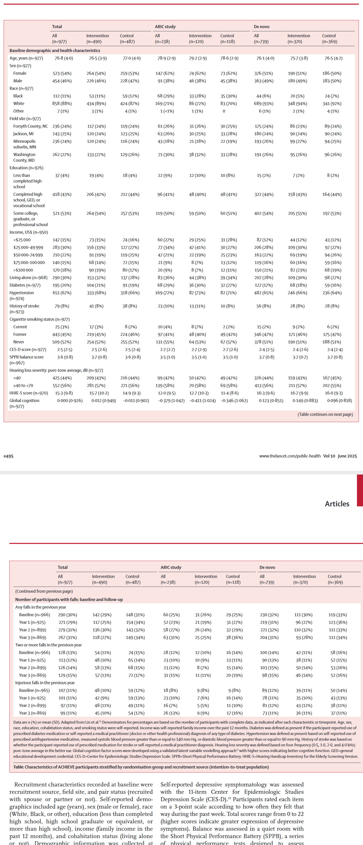 老年人衰老与认知健康评估(ACHIEVE)是一项为期3年、非盲法的随机对照试验,入组对象为70-84岁、伴有未经治疗的听力损失且无严重认知障碍的成年人。研究对象从美国四个社区研究中心的两类人群中招募:(1)一项正在进行的心血管健康观察性研究(社区动脉粥样硬化风险研究[ARIC])的参与者;(2)直接从社区新招募的志愿者(De Novo)。参与者按1:1比例随机分配至听力干预组(接受听力咨询并提供助听器)或健康教育对照组(接受慢性病预防主题的教学教育及拓展活动)。预先设定的探索性结局为跌倒事件。研究在基线时及随访三年期间每年评估受试者过去12个月内的自报跌倒情况,并采用意向性治疗分析法结合协变量调整进行分析。本研究已在ClinicalTrials.gov注册(注册号:NCT03243422),且已完成。